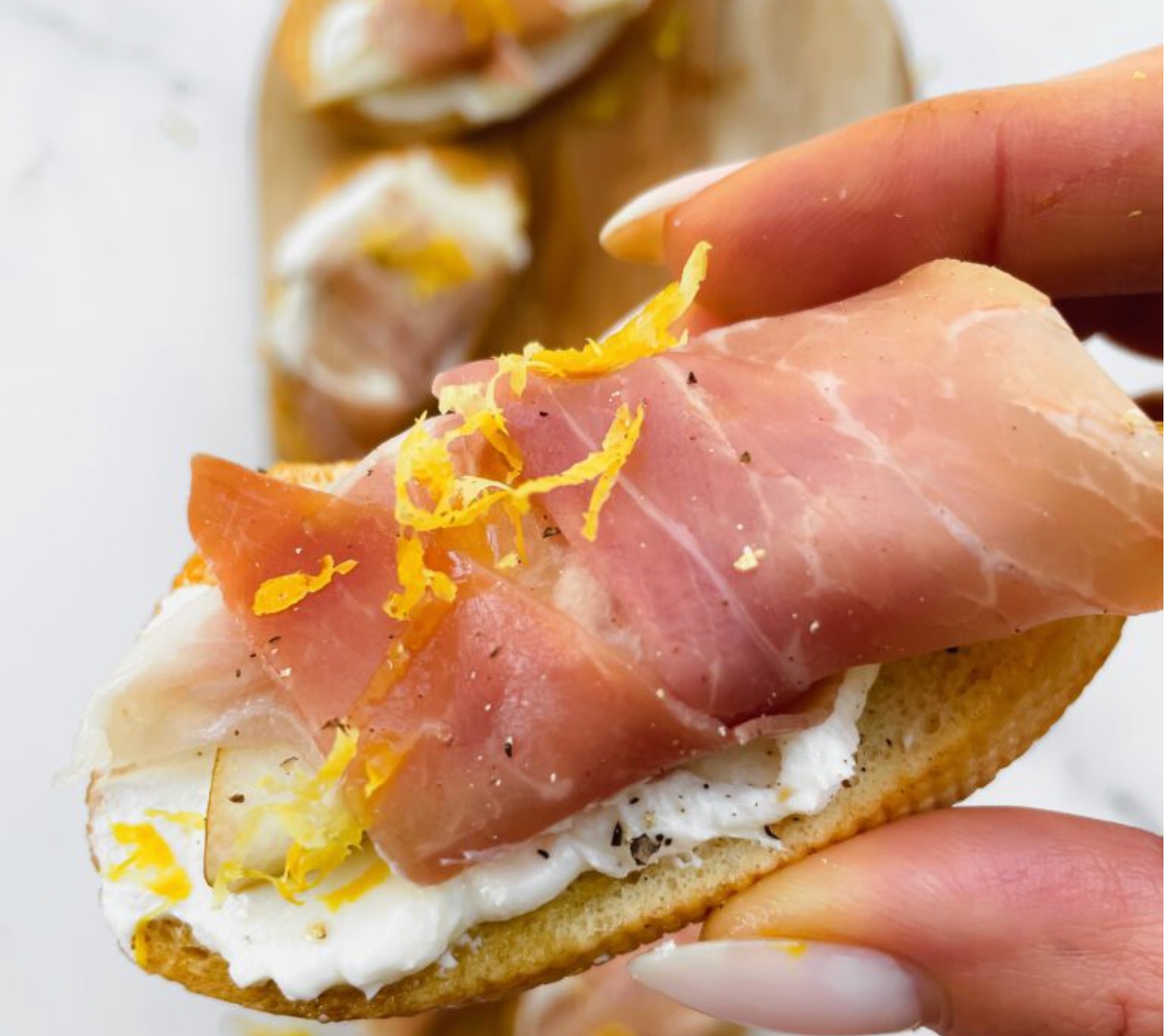 - Pear + Prosciutto Crostini with Whipped Goat Cheese
