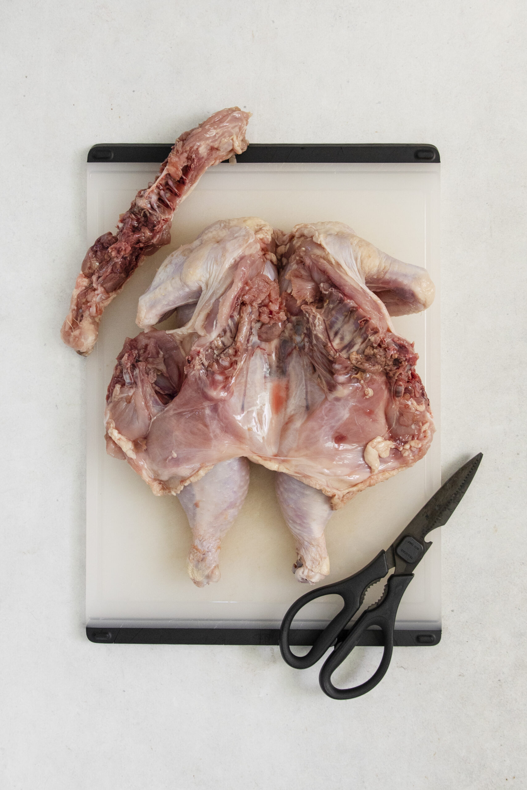 - Place the chicken on a cutting board, breast-side down. With kitchen shears, cut along both sides of the backbone to remove it. (I like to freeze the bone for stock later.) Flip the chicken over and press down firmly on the breastbone to flatten the chicken so it lies evenly. Pat the chicken dry with paper towels.