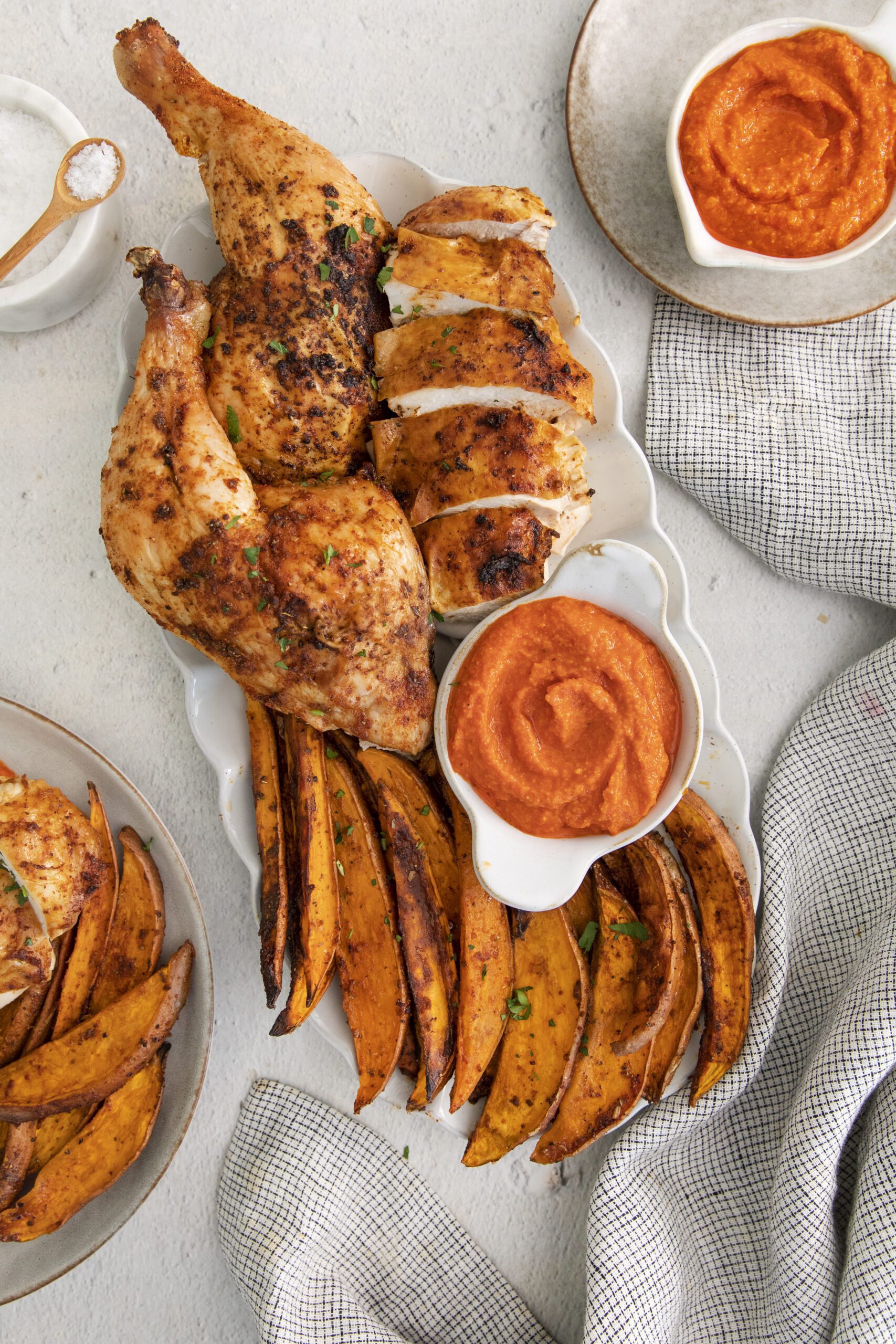 Let the chicken rest for 10 to 15 minutes. Then, carve the chicken into serving pieces and serve along with the potatoes and Romesco Sauce, if desired. It’s all good.