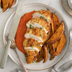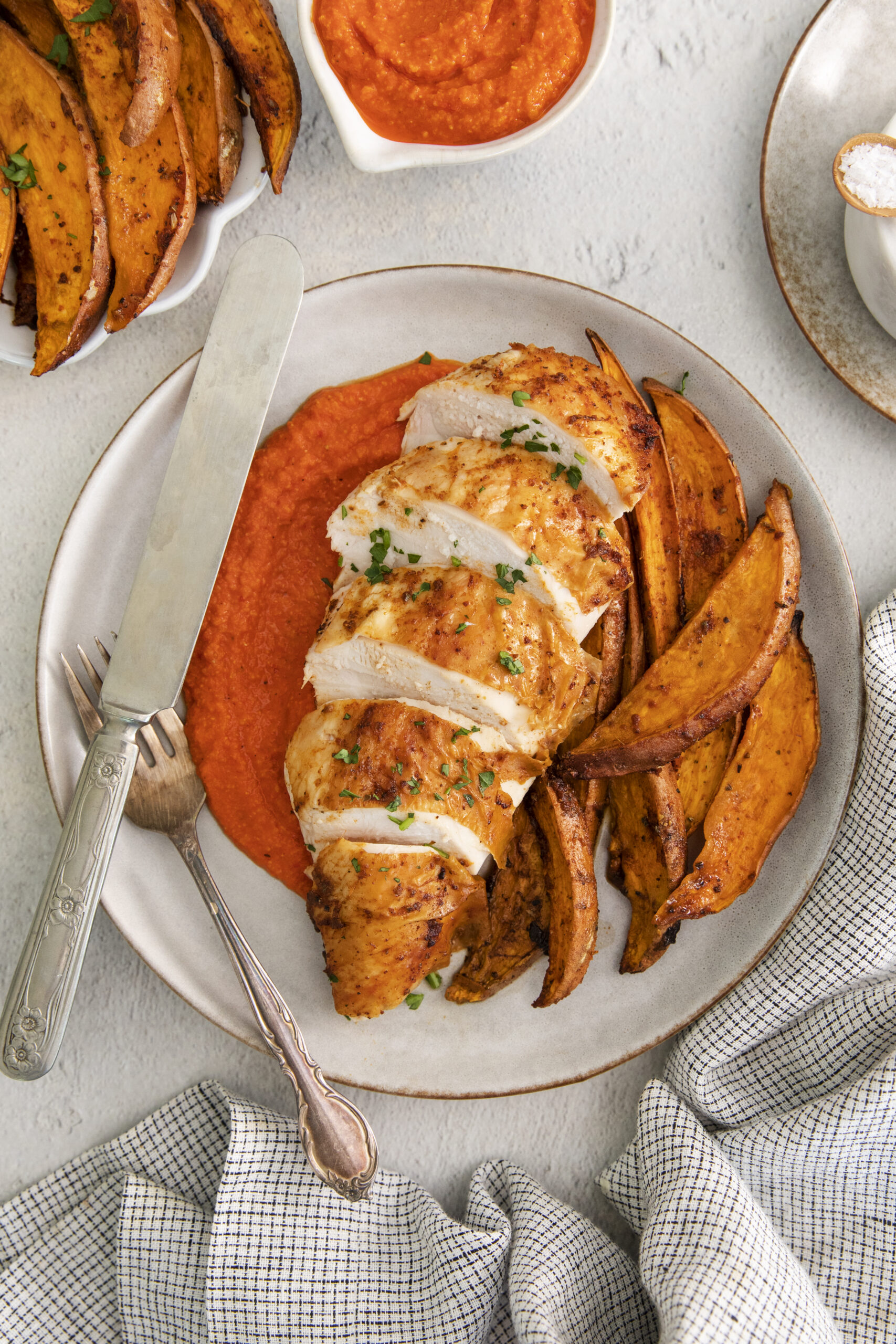 This is my go-to, one-pan chicken dinner and it’s totally something that qualifies as company-worthy! I love making my Roasted Chicken and Sweet Potato bake with my vibrant Spanish Romesco sauce. It’s one of those meals that feels a little special, but comes together simply and beautifully on a single pan. I mean, it is so simple!!