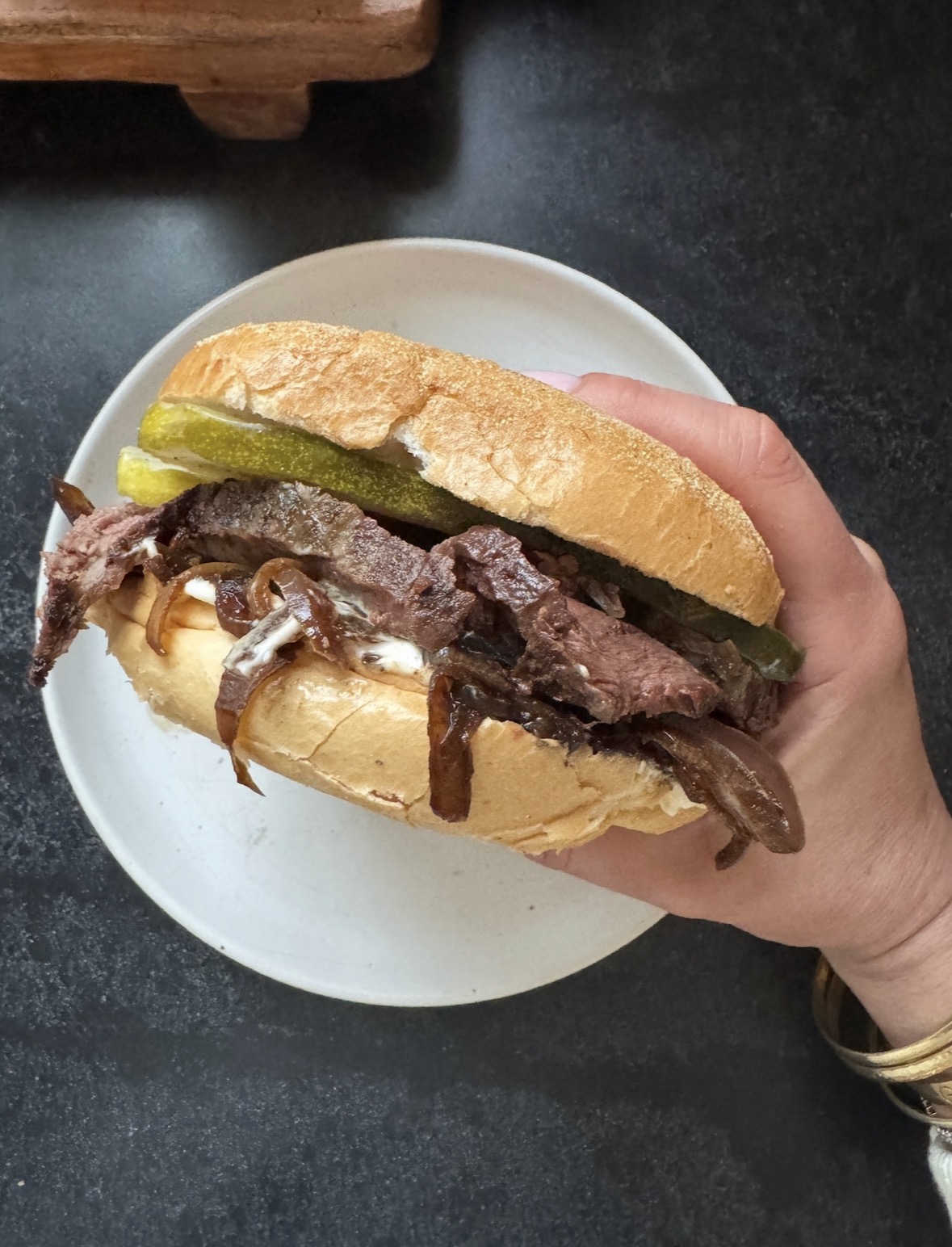 To build the sandwich, I pile everything onto a soft Kaiser roll: first the medium-rare slices of beef, then the glossy caramelized onions, a generous smear of horseradish mayo, and finally a slice of my favorite Grillo’s pickles. The pickle is key…it cuts right through the rich, savory layers.